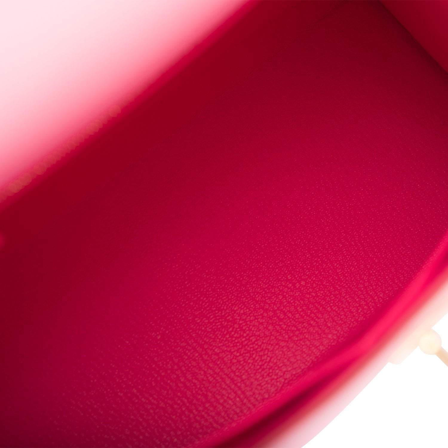 The interior is lined with Rose Lipstick chevre leather and has one zip pocket with an Hermes engraved pull and two open pockets on the opposite side.